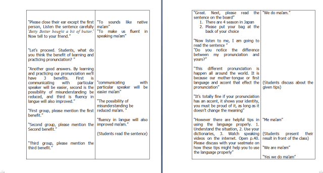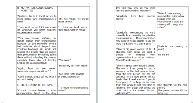 Each student prays before and after learning. For English subject, there’s always a student and sometimes teacher gives “Nuggets of Wisdom”. It is like quote of the day, where students should explain the meaning of the quote given and reflect it to their lives. After that, they proceed to spelling section but only on Monday, Wednesday, and Friday. On Monday teacher will pronounce the word and tell the meaning, students should write the spelling they hear. On Wednesday still use the same word, Teacher will show the words spell and student will write the meaning. And on Friday, students are given several minutes to review and write down the spelling and meaning of a given words. Then, teacher leads students to recap the material they had yesterday before continue to today’s material.